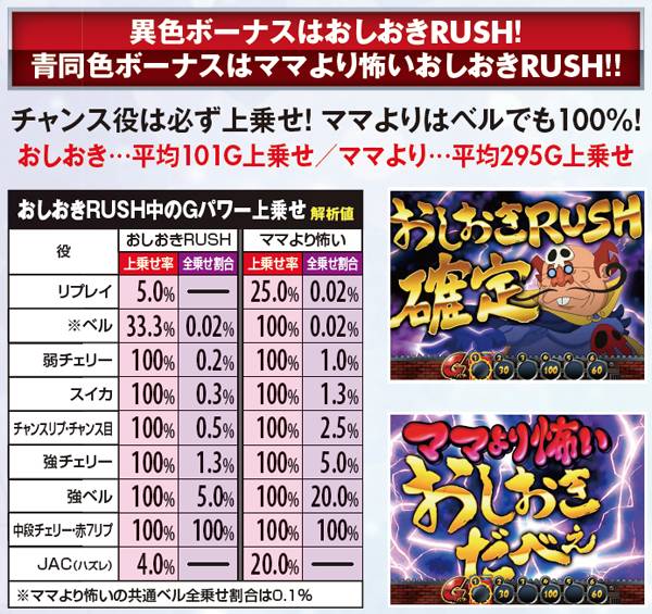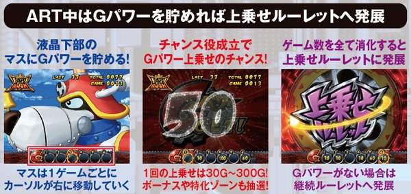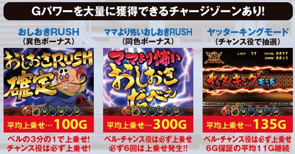 ART中のボーナス揃い時はGパワー大量獲得のチャンス。ママより怖いおしおきRUSHは期待大で、平均して300Gの上乗せが見込める。ベルで必ず上乗せされるヤッターキングモードはチャンス役を機に突入。6G保証で、平均11G継続だ。