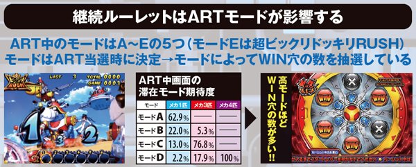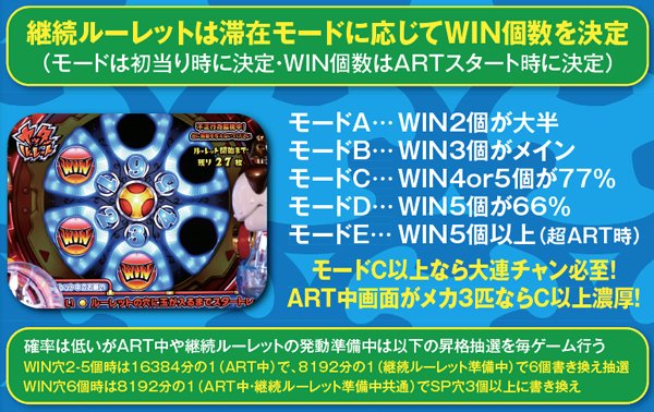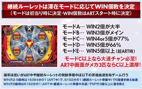 継続ルーレットのWIN穴数はARTモードを参照して決められる仕組み(2個以上は保証)。WIN穴4個以上が選ばれた場合は高モードが濃厚なので、その後もWIN穴多数のルーレットに期待できる。なお、滞在モードはART中画面で示唆され、メカ3匹はモードB以上、メカ4匹は激アツのモードD以上が約束される。