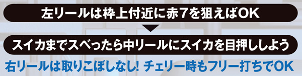 本機はフリー打ちだとチャンス役を取りこぼす恐れがあるので、DDT打法での消化が必須。手順は上記の通りで、チェリーの強弱は右リールの停止型から見極められる。なお、チャンス目時はリールフラッシュが発生する。