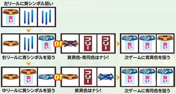 まず左リールに黄シンボルを狙い、これが止まれば黄異色or同色青ボーナス、これが止まらなかった場合は青異色ボーナスの可能性アリ。ボーナス成立から確定告知発生までは数ゲームかかるケースが多いので、ご覧の手順で迅速に揃えてコインと時間のロスを防ぎたい。