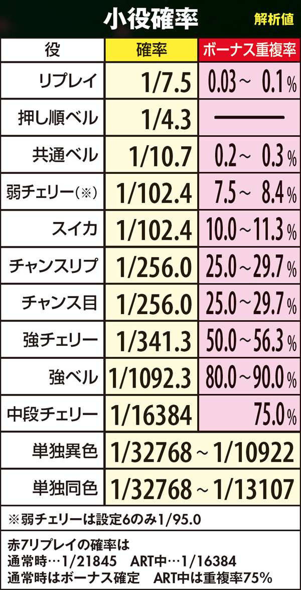 高設定はART直撃出現率が顕著に優遇。チャンス役から前兆を経てART告知といったパターンが頻発する台は、高設定と捉えて差し支えはなさそうだ。なお、突発ルーレットとART直撃は別物なので要注意。赤7リプレイと中段チェリーのART確定パターンもサンプルから除外しよう。