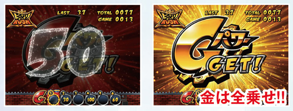 Gパワーチャージの主な契機はチャンス役で、1回の上乗せで30G~300Gの獲得が可能。ラストで始まる上乗せルーレットは、玉がGパワーの貯まった穴に入れば、その分のゲーム数を獲得できる。もちろん、これもヤッタールーレットなどと同様にガチ抽選だ。