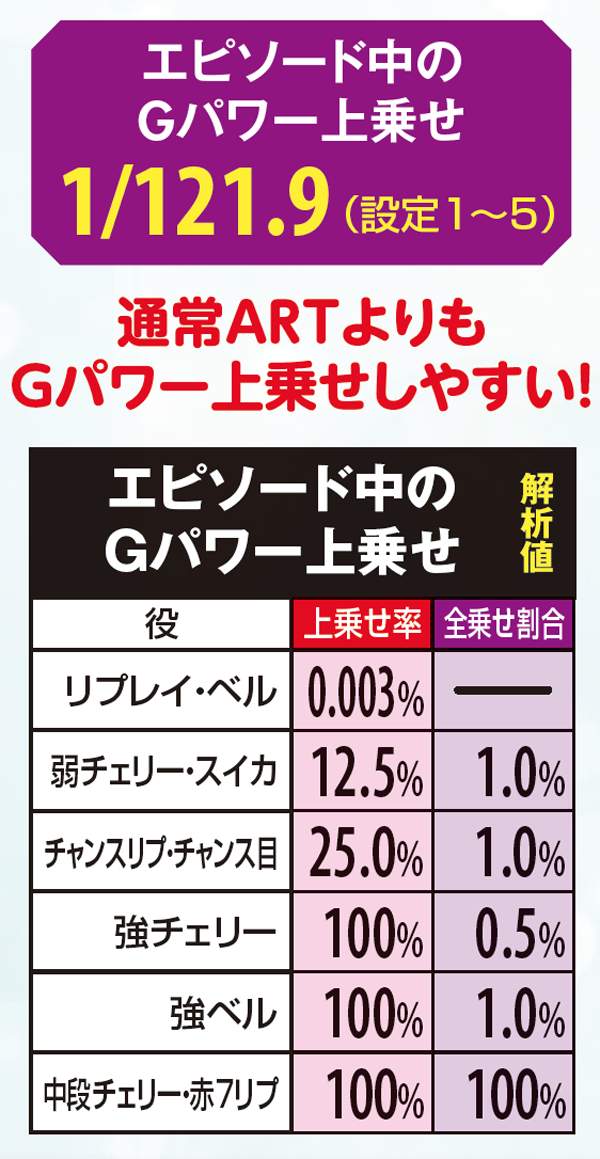 Gパワー直撃上乗せ期待度が高いのは強チェリーで、強ベルは上乗せ確定。契機を問わず当選時は30G~300Gが上乗せされるが、直撃上乗せはおまけ程度と捉えておきたい。