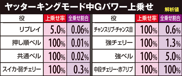 主にチャンス役を機に突入する上乗せ特化ゾーン・ヤッターキングモード中は、如何にして上乗せ確定のベルを引けるかが大きなポイント。継続ゲーム数は最低6ゲーム保証で、その後は上乗せナシ時のリプレイの26.3%で転落する(毎ゲーム換算で約4.1分の1)。