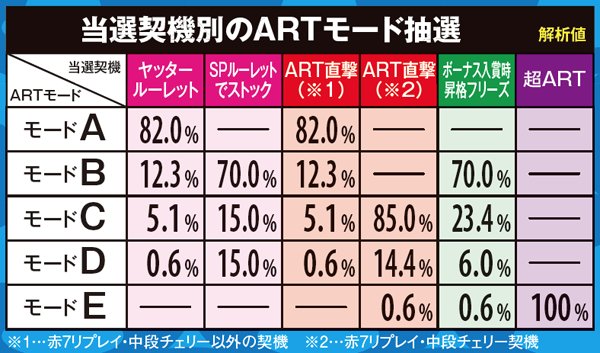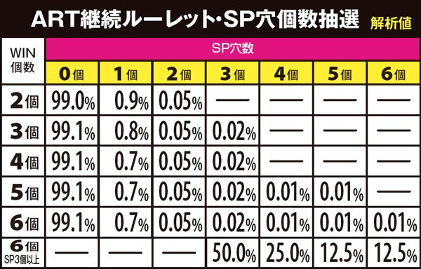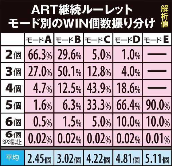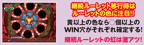 継続ルーレット時のWIN穴個数は、ART突入時に振り分けられるART継続モードを参照して決定。WIN穴4個以上が選ばれた場合はモードC以上が濃厚となるので、その後もWIN穴が多いルーレット、即ち高継続率に期待できる。