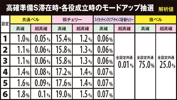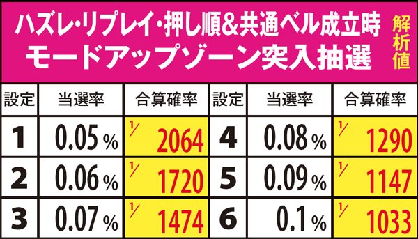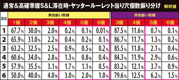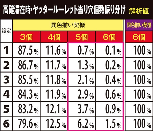 ピンクの枠で括られている3つのポイントには大きな設定差が存在。最も引く頻度が高いのは高確準備以下の異色揃いボーナスだが、ここで幾度となく4個以上が選ばれれば高設定に、1度でも6個が選ばれれば設定6に大いに期待してよいだろう。混同を避けるべく、当り穴6個確定パターンも把握しておきたい。