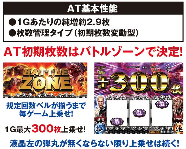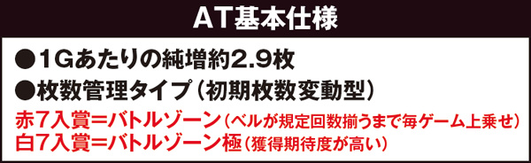 ATに突入したらまず初期枚数を決定するバトルゾーンに突入し、ベルが規定回数揃うまで毎ゲーム上乗せが発生する。赤7ではなく、白7が揃った場合は大量の初期枚数獲得に期待できる。
