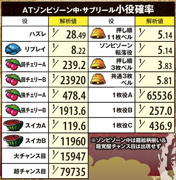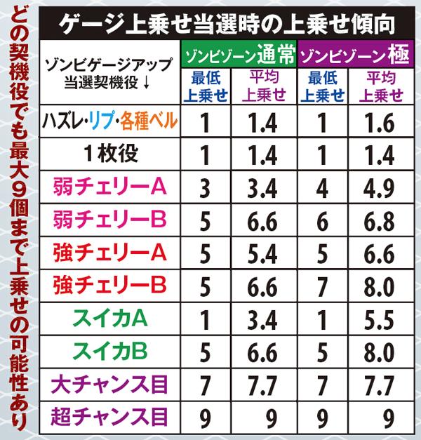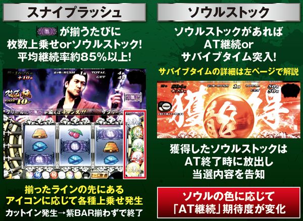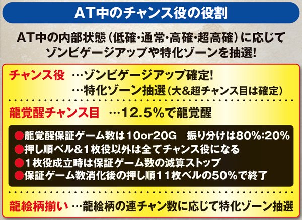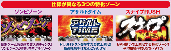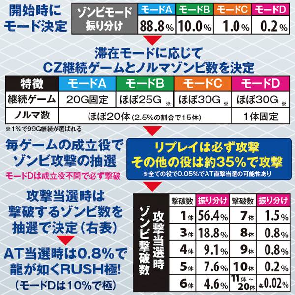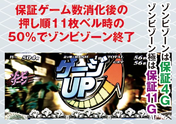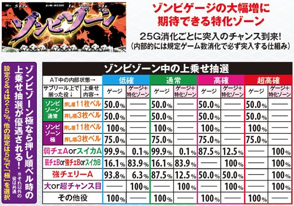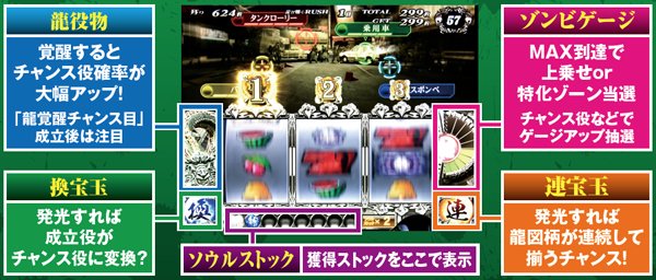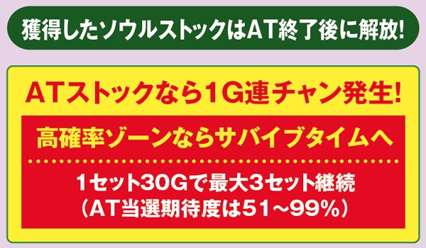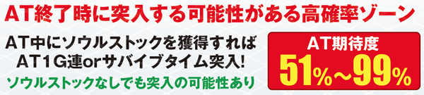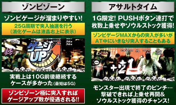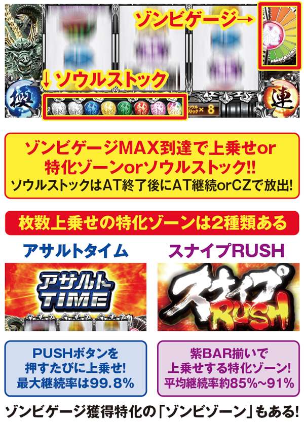 枚数上乗せの特化ゾーンだけでなく、ゾンビゲージの特化ゾーンも用意。また、枚数上乗せだけでなく、ソウルを獲得できれば規定枚数到達でATが終了してしまった場合もAT1G連やCZサバイブタイム突入によってAT初当りの即連に期待できる仕組みとなっている。