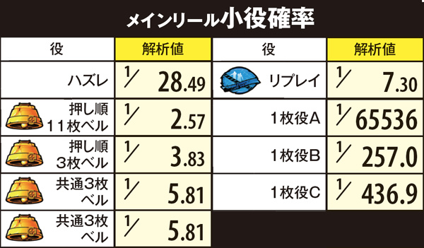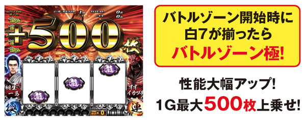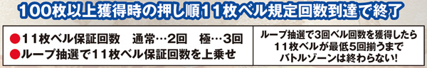初期枚数を決定するバトルゾーンはループ率に応じて11枚ベル保証回数を上乗せしている。規定回数到達後の11枚ベル成立時に継続抽選を行っているわけではない。なお、白7揃いは極確定となるが、赤7揃いでも0.5%で内部的に極が選ばれる。