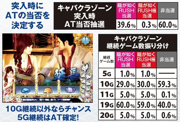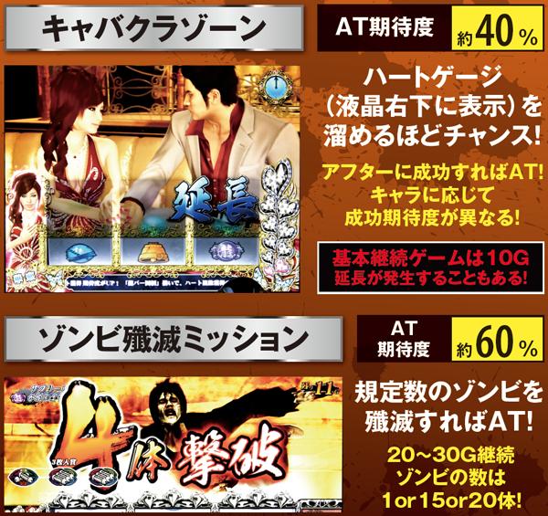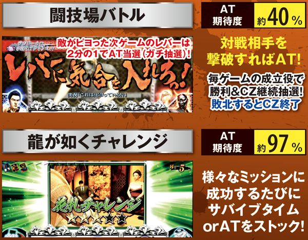 選択率が高いのはキャバクラゾーンや闘技場バトルで、どちらもAT期待度は約40%。龍が如くチャレンジが選ばれた場合は超激アツで、サバイブタイムやATの複数ストックに大きな期待が持てる。