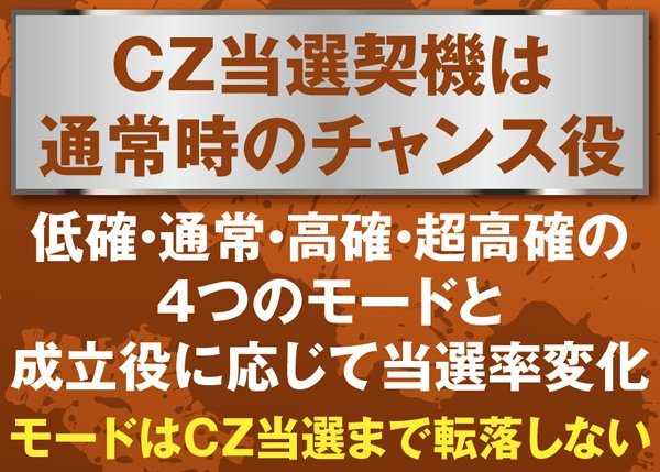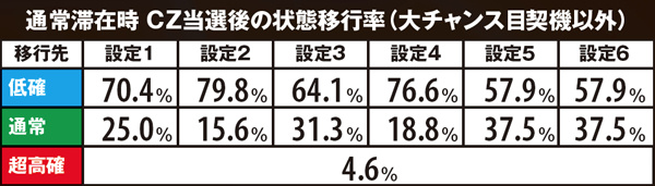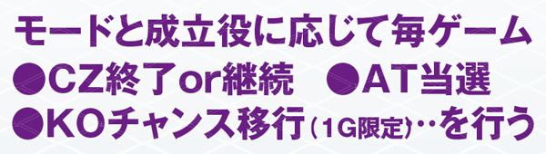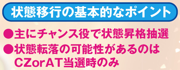 内部状態はCZに当選するまで転落しないのが特徴。CZ間で大きくハマっている台は、少ない投資でのCZ→AT当選のチャンスといえるだろう。