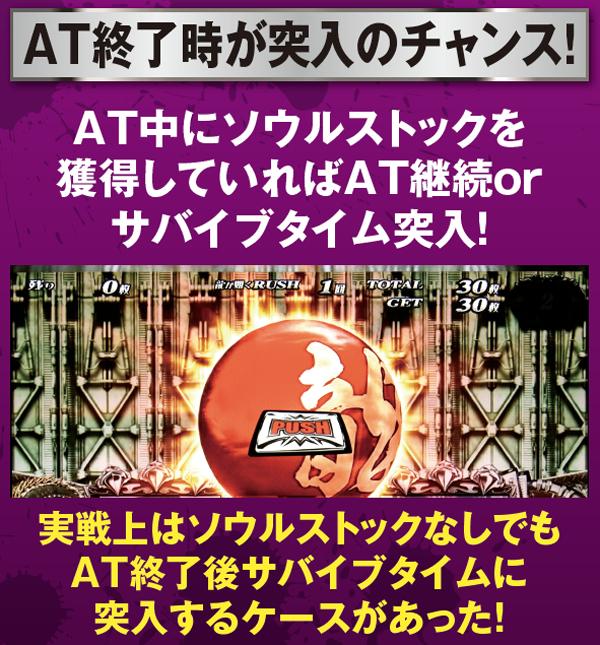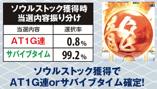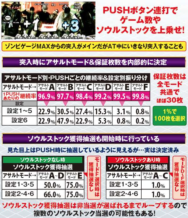 アサルトモードは6種類で、最低でも96.9%継続。ソウルストック抽選も開始時にアサルトモードと設定に応じて行われているが、この抽選は非当選までループするので、複数ストックの可能性もある。なお、ソウルストック獲得時はほぼサバイブタイムとなる。