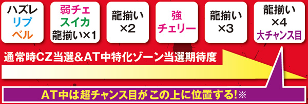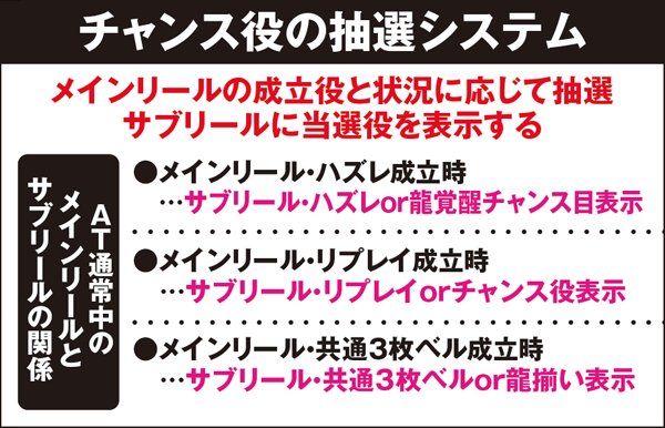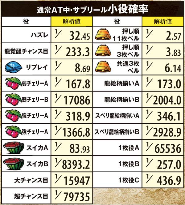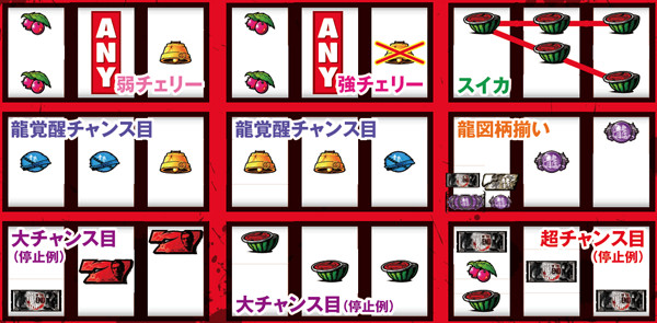 左リールに3番のチェリーを狙い、スイカまでスベった場合のみ残りリールでもスイカを狙うことで成立役の見極めが可能。フリー打ちでも枚数的な損失はないが、スイカやチェリーを(サブリールの見た目上は)取りこぼす可能性がある。なお、龍覚醒チャンス目と超チャンス目はAT中のみ成立するようだ。