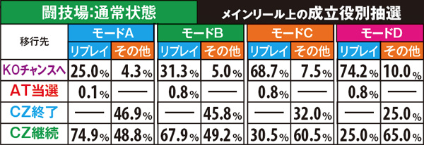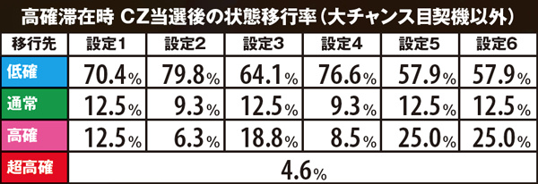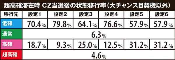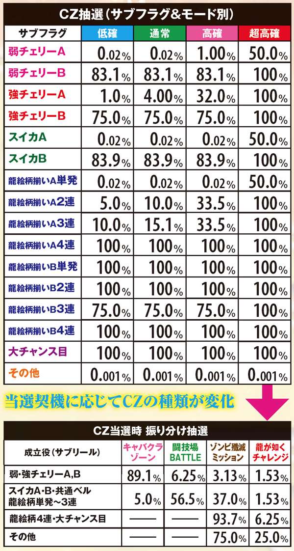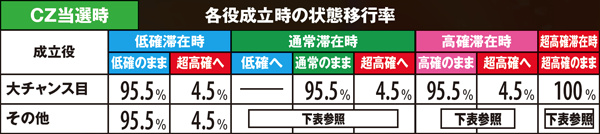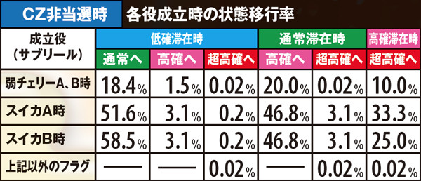 CZ当選率及び当選時の種類振り分け率は全設定共通。基本的にレアな役での当選時ほど期待度の高いCZに振り分けられやすい。