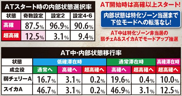 AT中はチャンス役成立時に内部状態に応じてゲージアップや特化ゾーンを抽選している。内部状態が良いほど当選率がアップし、超高確でのチャンス役は特化ゾーン突入確定だ。