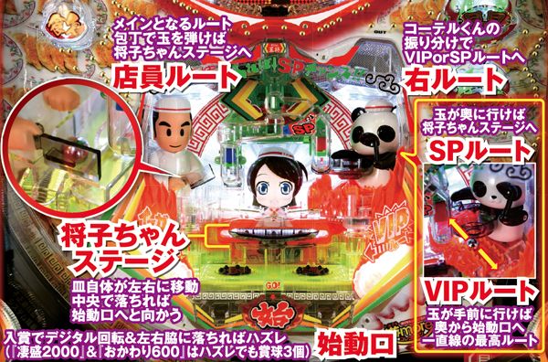 始動口に向かうまでには様々なルートがあり、メインとなるのが左の店員ルートで、店員の包丁に弾かれればチャンス。また高確率で始動口に導く右ルートは、連続入賞した玉が行きやすい傾向に。つまり玉を打ち続けることが、最大の攻略となりそうだ。