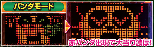 | 機種概要 | 出玉獲得までの流れや連チャンシステムは前作までを踏襲しているが、今作最大の注目が役モノの位置と構造。一般的なデジパチと同様の盤面構成であり、いわゆるヘソ部分から役モノに入った玉は、通常・SP(スーパーパンダ)・VIPの3つのルートいずれかを通過してデジタル回転。見事1・3・5・7・8のゾロ目揃いで大当りだ。1セット出玉獲得後は電チュー保留による「おかわりタイム」により連チャンに期待が持てる。 |