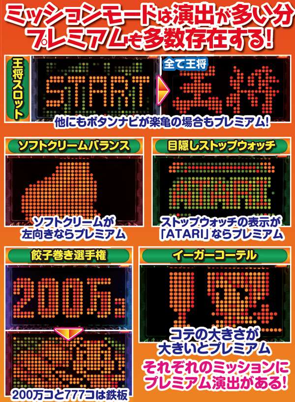 ミッションモードは各アクションにプレミアムが存在。王将スロットや餃子巻き選手権のように複数のパターンを持つモノもある。