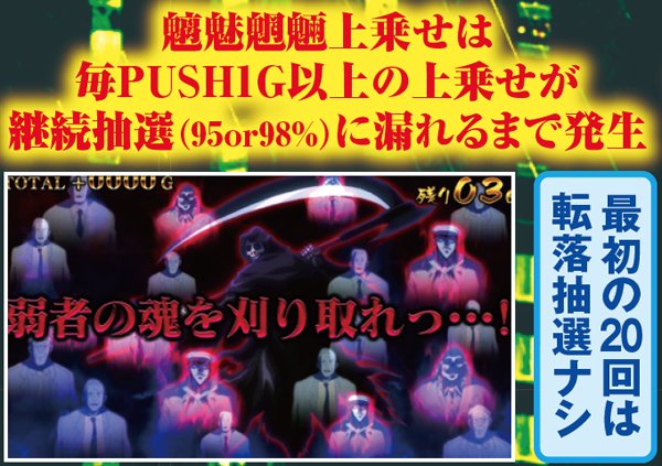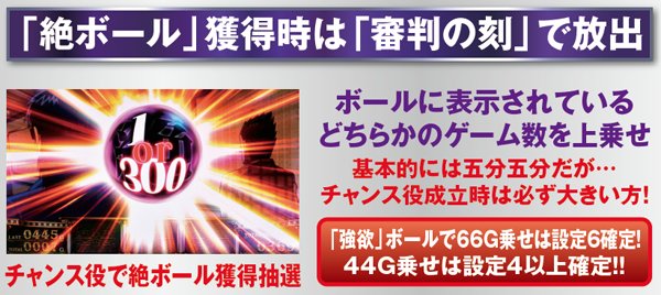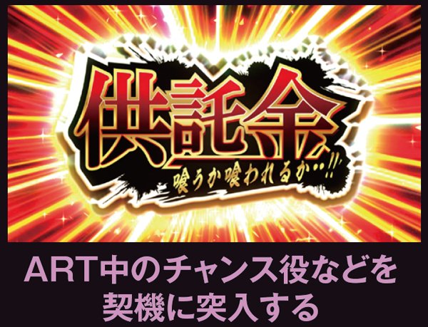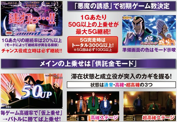 ART開始時は基本的に悪魔の誘惑に突入。毎ゲーム50G以上の上乗せなので、2G以上継続するだけで3ケタG数スタートとなる。ART中のゲーム数上乗せ契機は、メインとなるのが供託金モード、次いで絶ボールとなり、いずれも主にチャンス役成立時に突入(獲得)抽選を行うようだ。