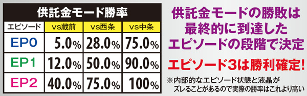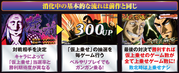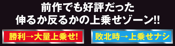 供託金モードへ突入すると、まずは対戦相手が決められる。消化中は毎ゲーム仮上乗せ抽選が行われ、ラストの対決で勝利すれば仮上乗せが全て上乗せされる。一方、敗北時は上乗せナシ。この伸るか反るかの瞬間が、本機最大の魅力といっても過言ではない。
