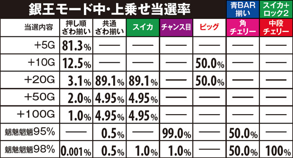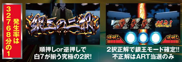 銀王の二択発生時は2択正解で銀王モードへ突入するが、ハズレ時はART当選のみと、その恩恵は大きく変化する。ちなみに押し順不問の白7揃いもあり、成立時はロングフリーズが発生するようだ。