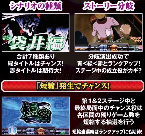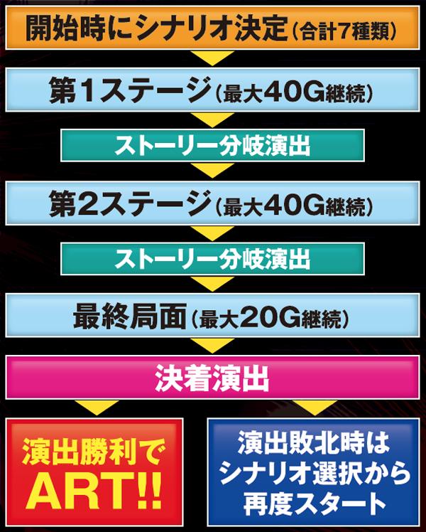まずは全7種類のシナリオの中から開始時に1つを選び、以後はそのシナリオに沿ってゲームが進行する。ストーリーは第1ステージ、第2ステージ、最終局面の3パートに分かれており、各ステージ間で発生する分岐演出に成功すればストーリーの進行が有利になる。途中でチャンス役を引くと残りゲーム数の短縮抽選が行われる。