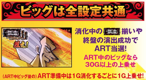 原作の世界観を活かしたゲーム性で多くのファンを虜にしたタイヨーエレックの人気作『パチスロ銀と金2』が登場。 通常時は最大約100G継続のストーリーが展開。ストーリーの分岐によってART期待度が異なる仕組み。 ARTは純増約1.6枚で、開始時は上乗せ特化ゾーン「悪魔の誘惑」で初期ゲーム数決定する。 |