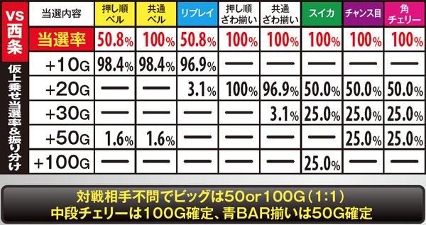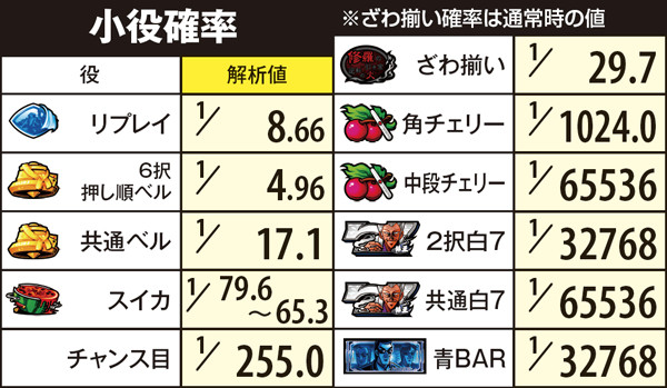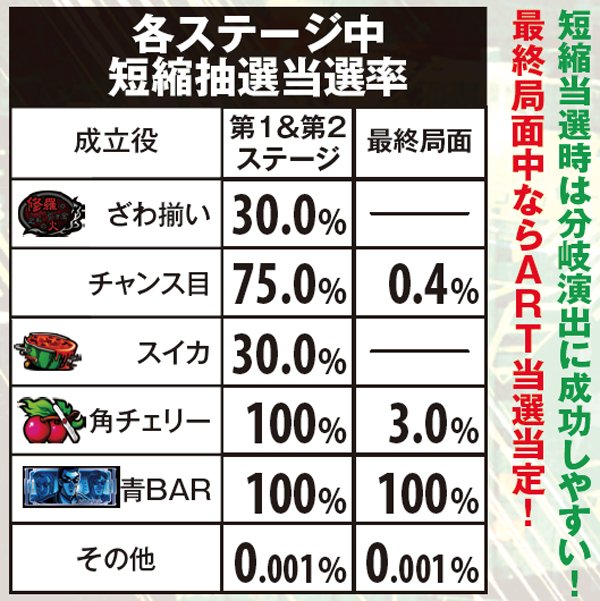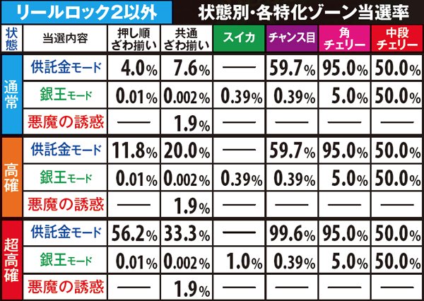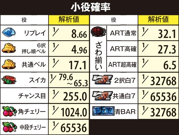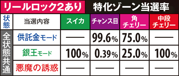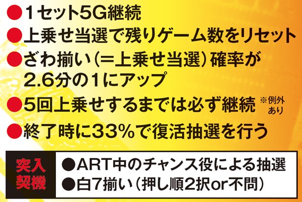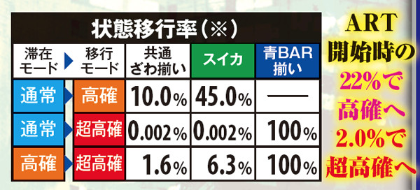 ART中は滞在中の状態と成立役を参照して、状態昇格および特化ゾーンの抽選を行う。状態昇格に期待できるのは共通ざわ揃い&スイカ、特化ゾーン当選時は大半が供託金モードだが、リールロック2ありのスイカと中段チェリーは必ず銀王モードに当選するので鬼アツだ。