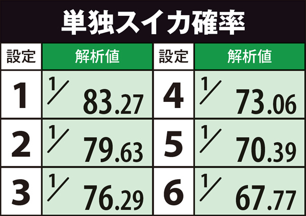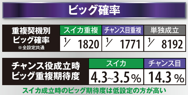 黒BAR揃いのビッグ確率は全設定共通809.1分の1。擬似ではなく本物のボーナスで、引くタイミングに応じて消化中にART抽選または上乗せ抽選を行う。純増312枚も非常に魅力的だ。