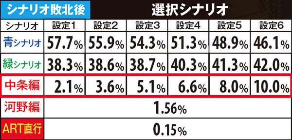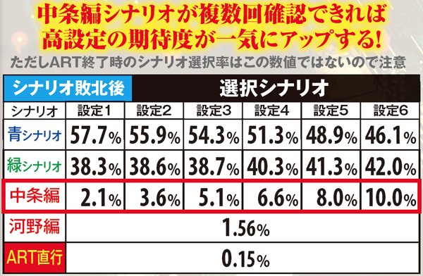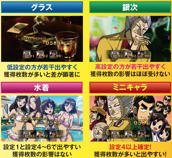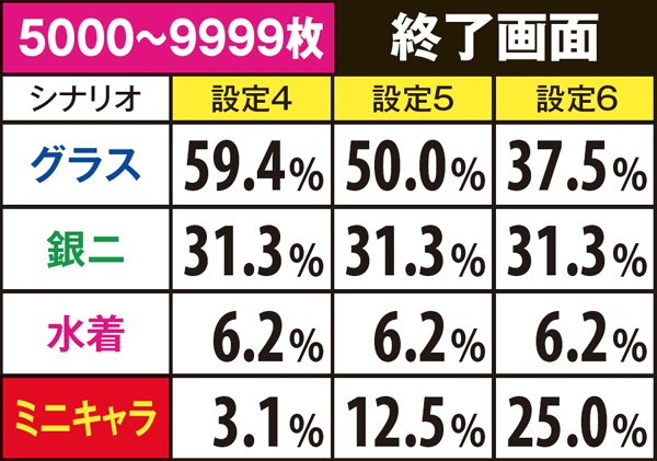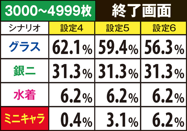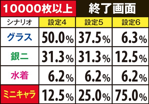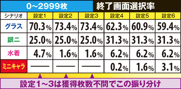 全部で4種類あるART終了画面は設定示唆の役割を担っており、それぞれの選択率に上記のような特徴がある。出現時にアツいのはミニキャラで、いかなる状況でも無条件で設定4以上が確定。水着は高設定で選ばれやすいが、同時に設定1の可能性も高まる天国or地獄の振り分けになっている。