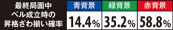 最終局面中は昇格ざわを含む全てのチャンス役でART抽選を行っており、液晶画面の背景の色が昇格(青<緑<赤)するほど昇格ざわ発生率およびART当選率がアップする。ざわ揃いの昇格抽選はベル成立時に行われ、トータル発生率は上表の通りとなる。ちなみに、ベルは入賞しなくても昇格抽選を行うので、何も揃わなかった次ゲームに昇格ざわ揃いが発生する可能性もある。