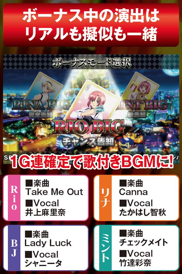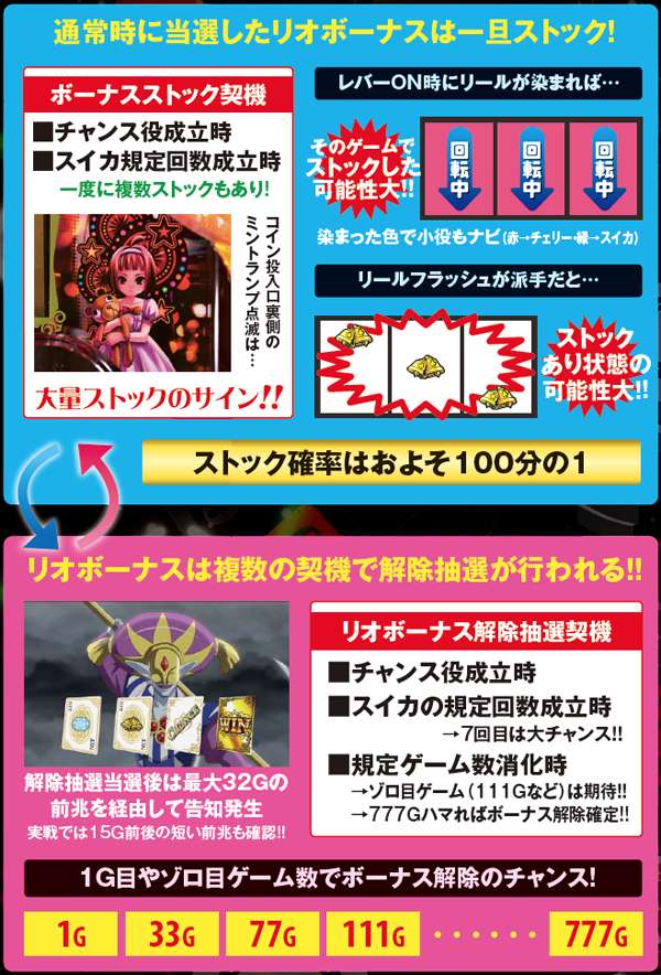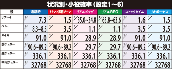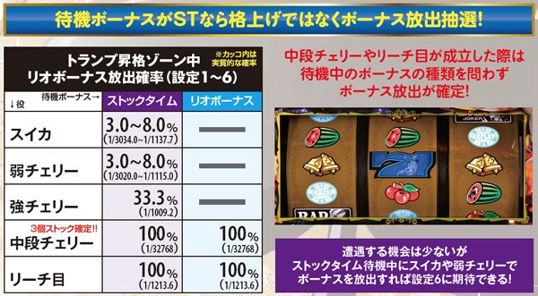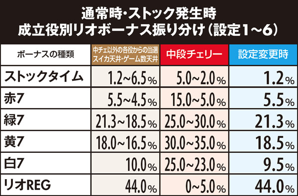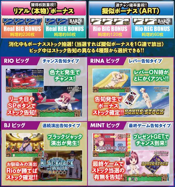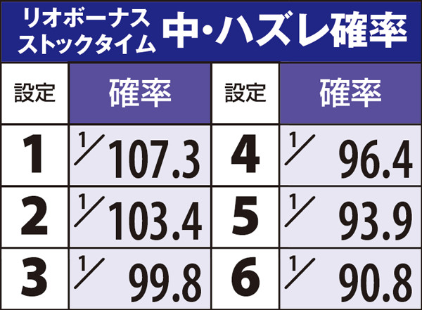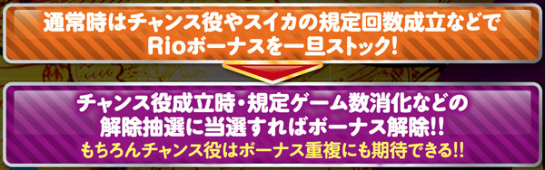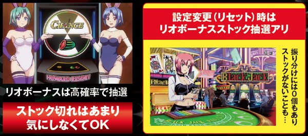 通常時はおよそ100分の1の確率でリオボーナスをストック。全停止時にミントランプが点滅すれば大量ストックのサインとなるが、基本的にストックがあるのが前提のゲーム性につき、設定変更後もストック切れの心配はほぼないと思われる。