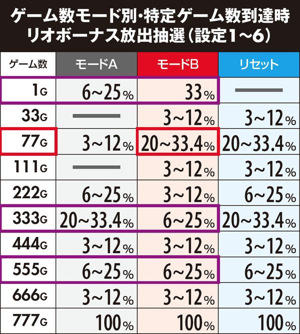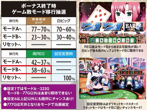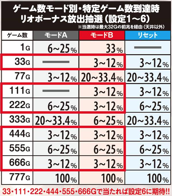 通常時は3種類のモードでリオボーナスのゲーム数抽選を管理しており、特定ゲーム数に到達するとモードと設定を参照して放出抽選を行う。最も滞在しやすいモードAはあまり期待できないが、モードBに移行した場合は期待度が大幅アップ。速攻連チャンの可能性も高いので、モードBに移行しやすいREG後はハイチャンスだ。