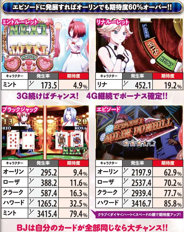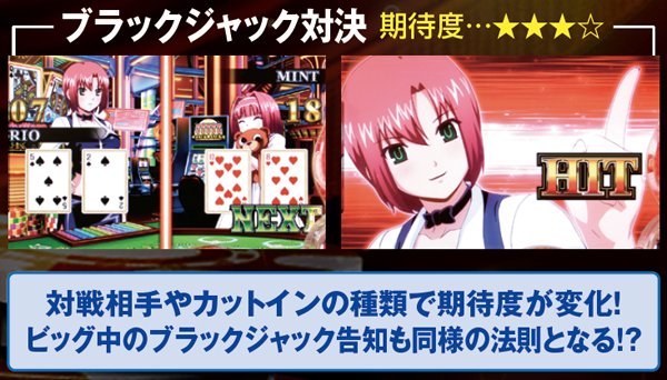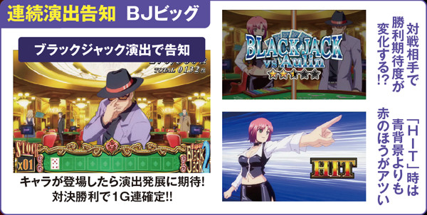 今作に用意された連続演出は上記の通り。BJ対決は対戦相手&カットインの種類で期待度が変化。エピソード演出はいずれも発生しただけで激アツだ。