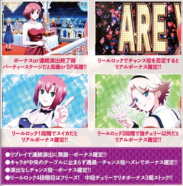リールロックはチャンス役対応につき、チャンス役を否定すればリアルボーナスが確定する。また、連続演出終了時にパーティーステージから始まれば、高確以上が確定するのでハイチャンスだ。