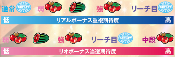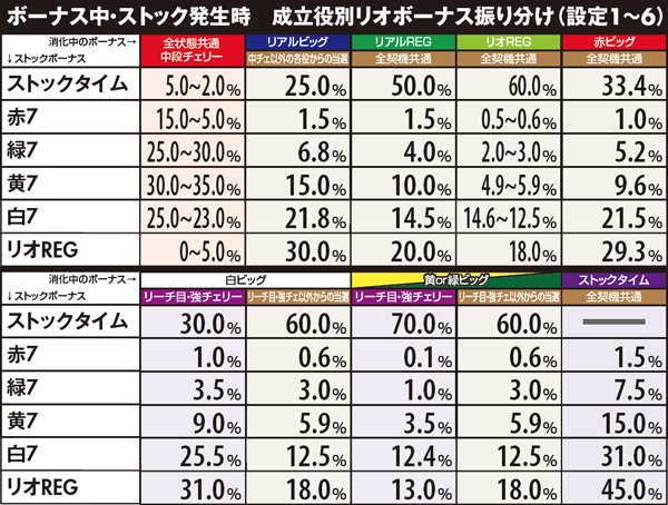 リアルボーナスはベル以外の全役と重複成立する可能性あり。リオボーナス(擬似)はチャンス役成立時にストック&放出抽選を行っている。