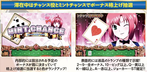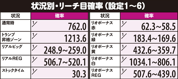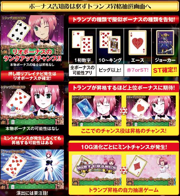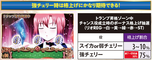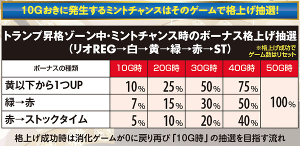 トランプ昇格ゾーン(準備中)は最大の叩きどころ。内部的には放出される予定のボーナスが既に決まっているが、チャンス役およびミントチャンス時に所定の割合で格上げ抽選を行うのだ。リオボーナス中にリアルボーナスを引いた場合、RT復帰に時間を要するぶん期待度はかなり高い。