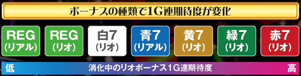 ボーナスはリアル&擬似の2種類があるが、いずれも消化中に擬似ボーナスの1G連抽選を行う。チャンス役を引けば文字通りチャンス、リーチ目が出現すれば問答無用で1G連が確定する。なお、擬似ボーナス中にリアルボーナスを引いた場合は、リアル消化後に擬似ボーナスが最初からスタートするので超お得だ。