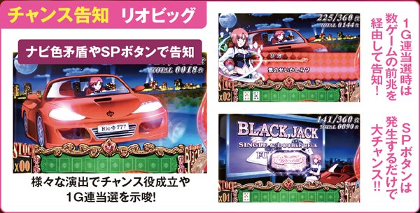 今もなお多くのファンを魅了してやまないRioシリーズの原点、通称『SBJ』が、デビューから12年の時を経て華麗に復活!! 「ボーナスは高確率で成立するが一旦内部に貯留され、規定条件を満たした場合に放出される」…という初代のシステムをRioボーナス(擬似ボーナス)で再現しており、様々なシーンでボーナス連チャンが発生する仕様となっている。 |