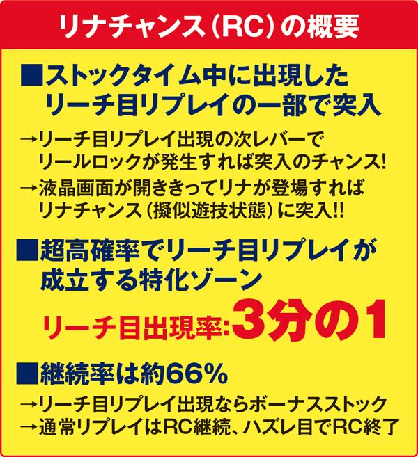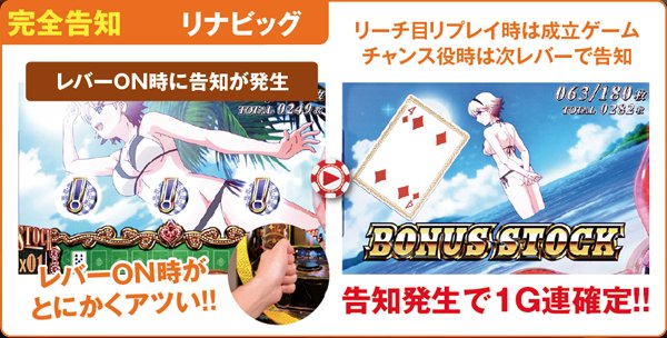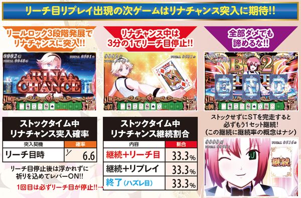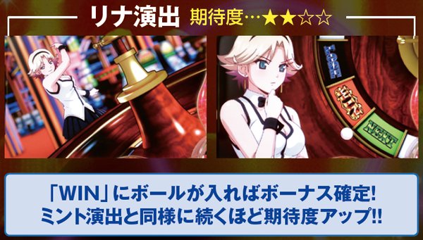 リーチ目リプレイ出現の次ゲームは激アツ。リールロック3段階目に発展すれば、上乗せ特化ゾーンのリナチャンスに突入するのだ。リナチャンス中は左「スイカ・青7・スイカ」停止で赤ビッグ1確。リールが5コマ以上スベったらリーチ目が確定だ。