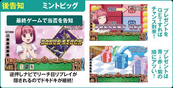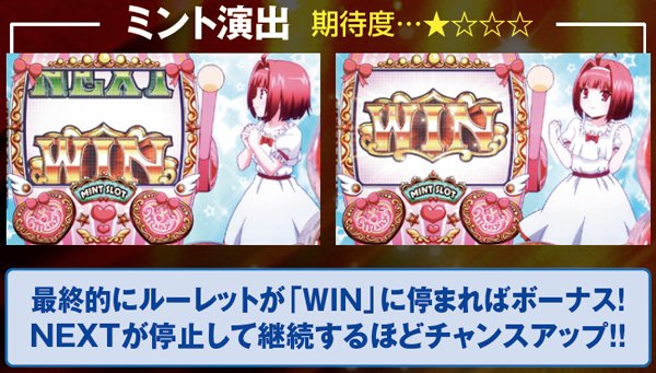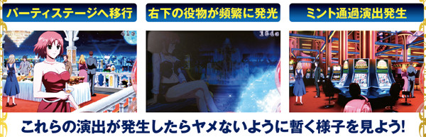 チャンス役でリオボーナスに当選またはゲーム数解除が近づくと、上記のような前兆演出が発生しやすくなる。初代SBJで激アツだったミントは今回も健在なので、登場の効果音に耳を澄まそう。
