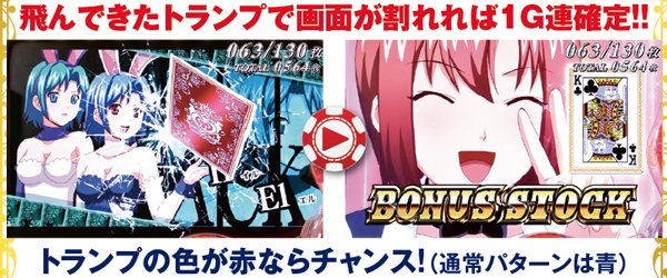 REG消化中の1G連抽選は期待度があまり高くないが、当選したならカードが画面を割る演出で告知される。飛んできたトランプの色が赤ならチャンスだ。