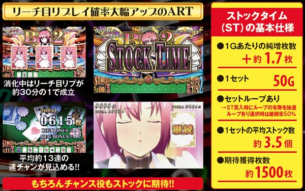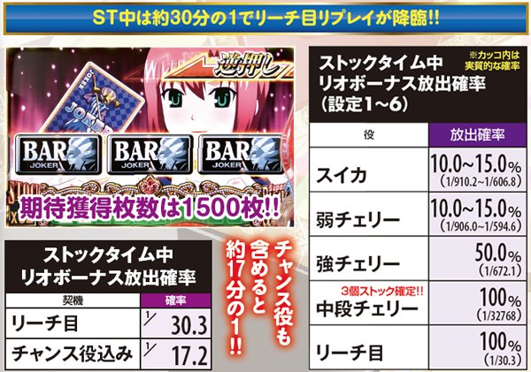 ストックタイム中はリーチ目確率が約30分の1にまで大幅アップ。各種チャンス役も含めると毎ゲーム約17分の1の確率でボーナス放出の権利をストックする。ボーナス中も漏れなく放出抽選を行うため期待獲得枚数は1500枚となる。