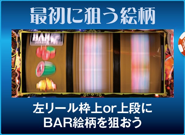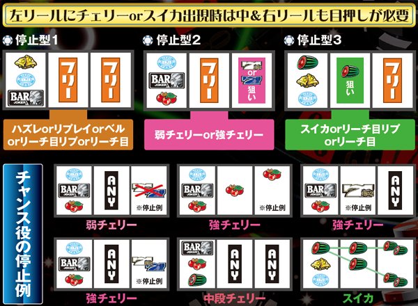 チェリーは3連または中リールに「チェリー・白7・チェリー」が停止しても強チェリーになる。左上段スイカ停止時は中リールにスイカを狙ってフォローしよう。