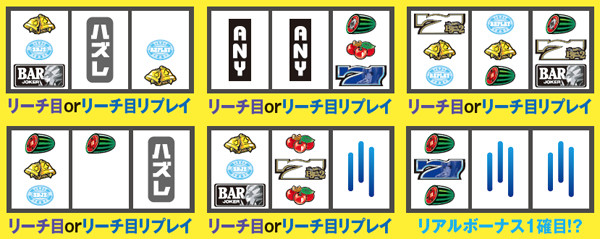ベル&リプレイのダブテンハズレやスベリスイカのテンパイハズレなど、他機種でいうチャンス目が本機では全てリーチ目となる。ゲチェナも鉄板目だ。