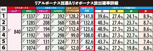 リアルビッグ抽選確率には設定差がないので、差が大きくサンプルを得やすいリオボーナスの合算出現率で設定を推測するのがベスト。また、リオビッグは低設定ほど上位の色が選ばれやすい。