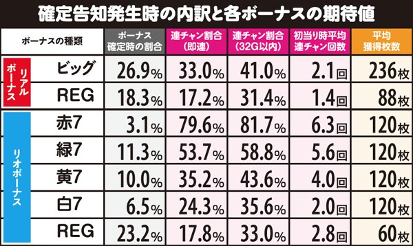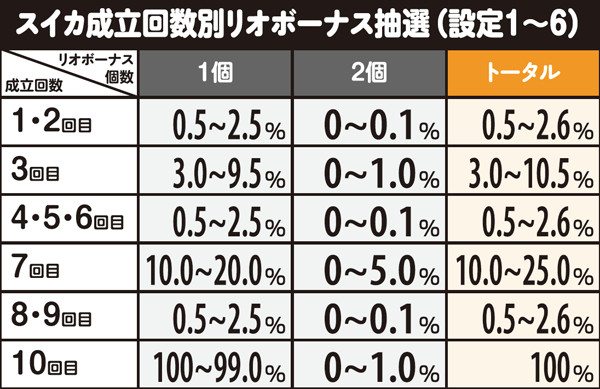 リオボーナスは一度の放出抽選で稀に2個当選することがある。表内の「0」は無抽選なので設定1は0%、すなわち2個出てきたら設定1が否定されるが、ボーナス消化中の1G連当選を把握しておく必要があるので要注意だ。なお、2個当選時にはボーナス終了時にWINランプが点灯する。