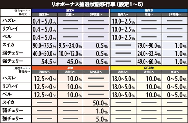 本機は4種類の内部状態でリオボーナスの放出確率を管理している。基本的に通常A→通常B→高確→SP高確の順に期待度が高く、上位状態に昇格したなら保証ゲーム数を消化後に毎ゲーム転落抽選を行う。状態のメイン昇格契機はスイカだ。
