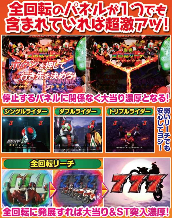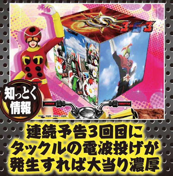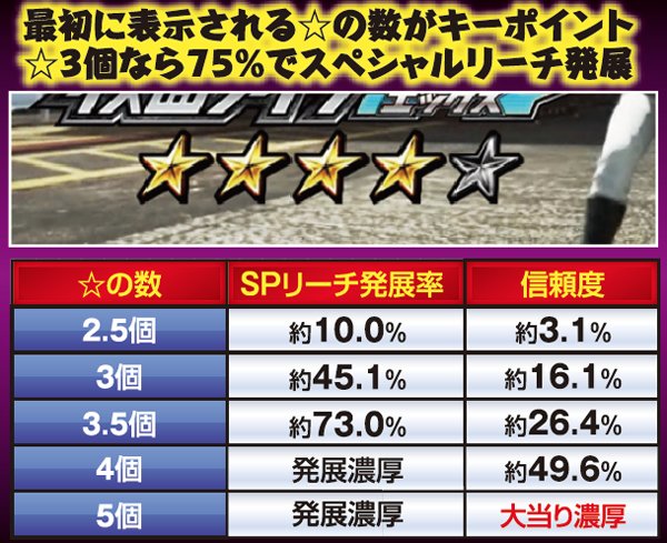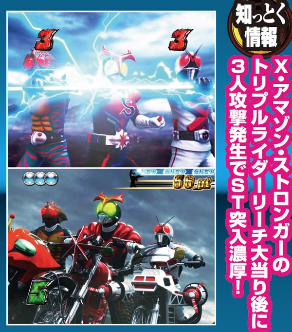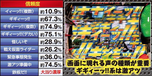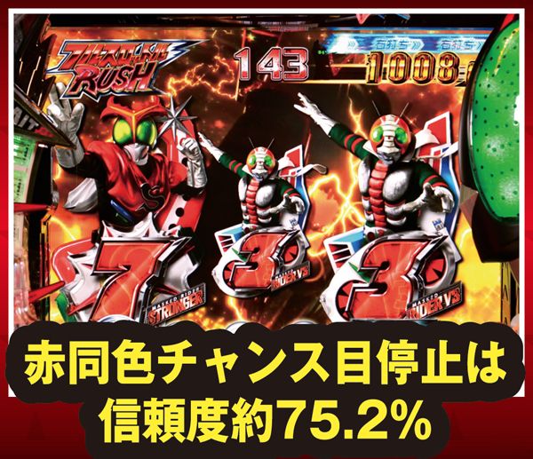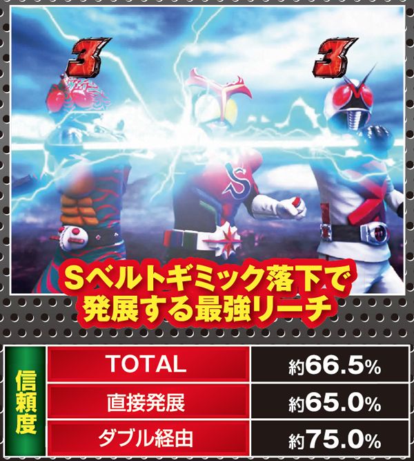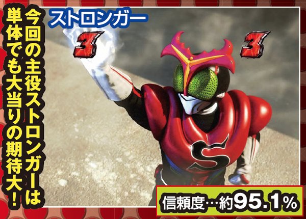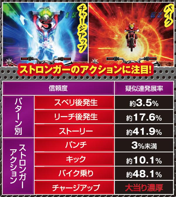 疑似連時は連続回数以外にストロンガーアクションにも注目。疑似3連でライダー変身リーチへの発展が色濃くなる。