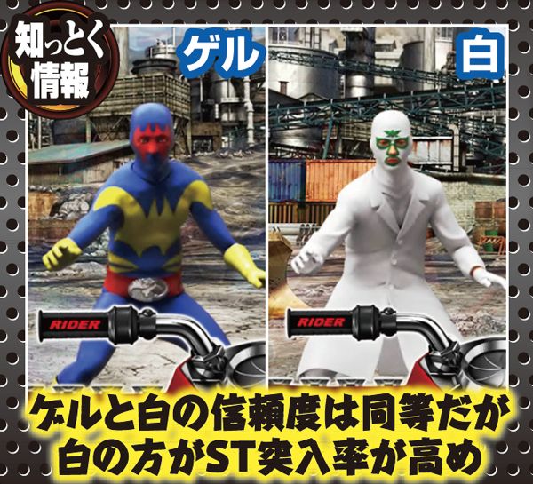 ゲルと白戦闘員が同時出撃で大当り濃厚に。また、白戦闘員は当たればST突入率アップという法則も。